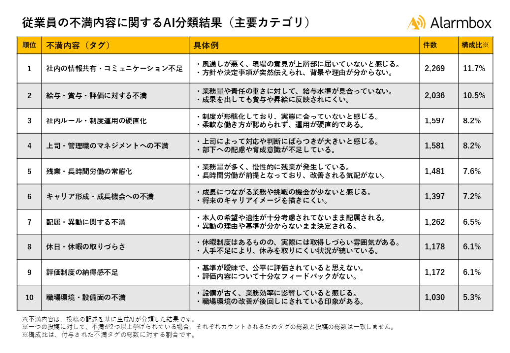 対象データ:インターネット上に投稿された口コミのうち、アラームボックスが「従業員による不満投稿」と分類したもの