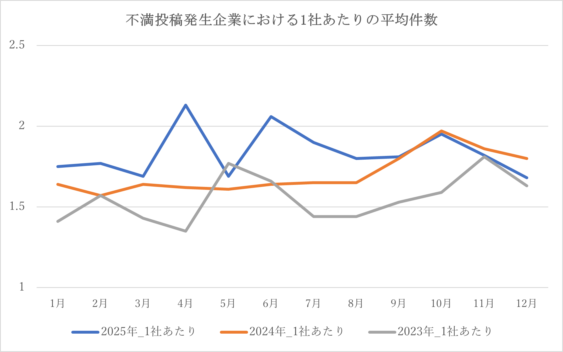 なお、2025年の推移を見ると、4月時点においても1社あたりの不満投稿件数が過去2年と比べて高い水準にありました。年度初期は比較的投稿量が落ち着く傾向も見られますが、特に2025年は、年内の月別比較においても4月の1社あたり件数が相対的に高く、新年度開始直後の段階から投稿密度が高い状態で推移していました。