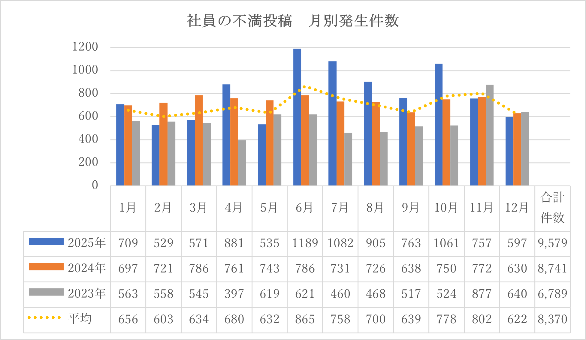 調査結果から、従業員による不満投稿は年間を通じて一定ではなく、4月、6月、10月を中心に増加しやすい時期があることが確認されました。