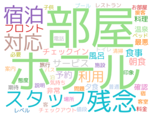 あわせて、フロントやスタッフの対応に触れた投稿も多く、接客時の印象や説明の受け取り方が評価に影響している様子がうかがえます。クレームでの頻出単語を見ても、「部屋」「スタッフ」「対応」「残念」「利用」などの語が多く出現しており、宿泊体験全体に関わる内容が幅広く投稿されていることが分かります。