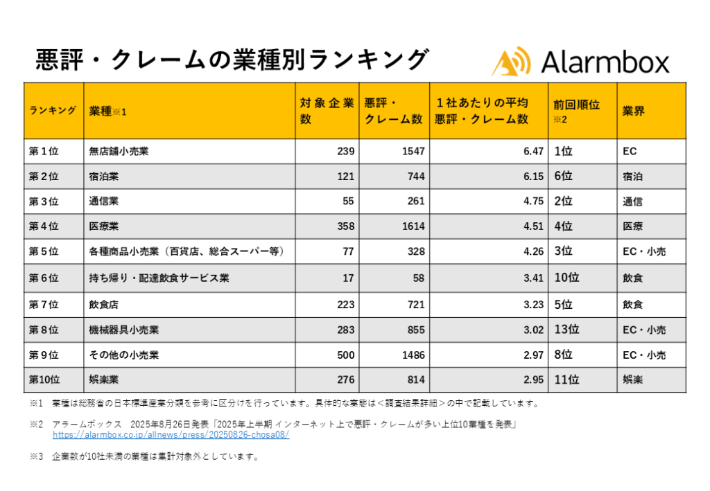 AI与信管理サービスを提供するアラームボックス株式会社(本社:東京都新宿区、代表取締役:武田浩和、以下「当社」)は、この度、10,778社を対象に、2025年下半期にSNS等インターネット上で投稿された各企業に関連する口コミや評判の中から悪評・クレームを抽出し「2025年下半期 インターネット上で悪評・クレームが多い上位10業種」を集計しましたので発表します。また、本調査を開始した2022年以降の業種別の順位推移も合わせて発表します。