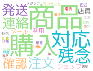 加えて、問い合わせへの対応や、返品・交換・キャンセル時の対応を巡る不満も多く、クレームでの頻出単語を見ても「購入」「商品」「発送」「連絡」「対応」といった言葉が目立ちます。購入から発送までの進捗や対応方針を適切に伝えることが、不要な悪評・クレームの抑制につながるといえます。
