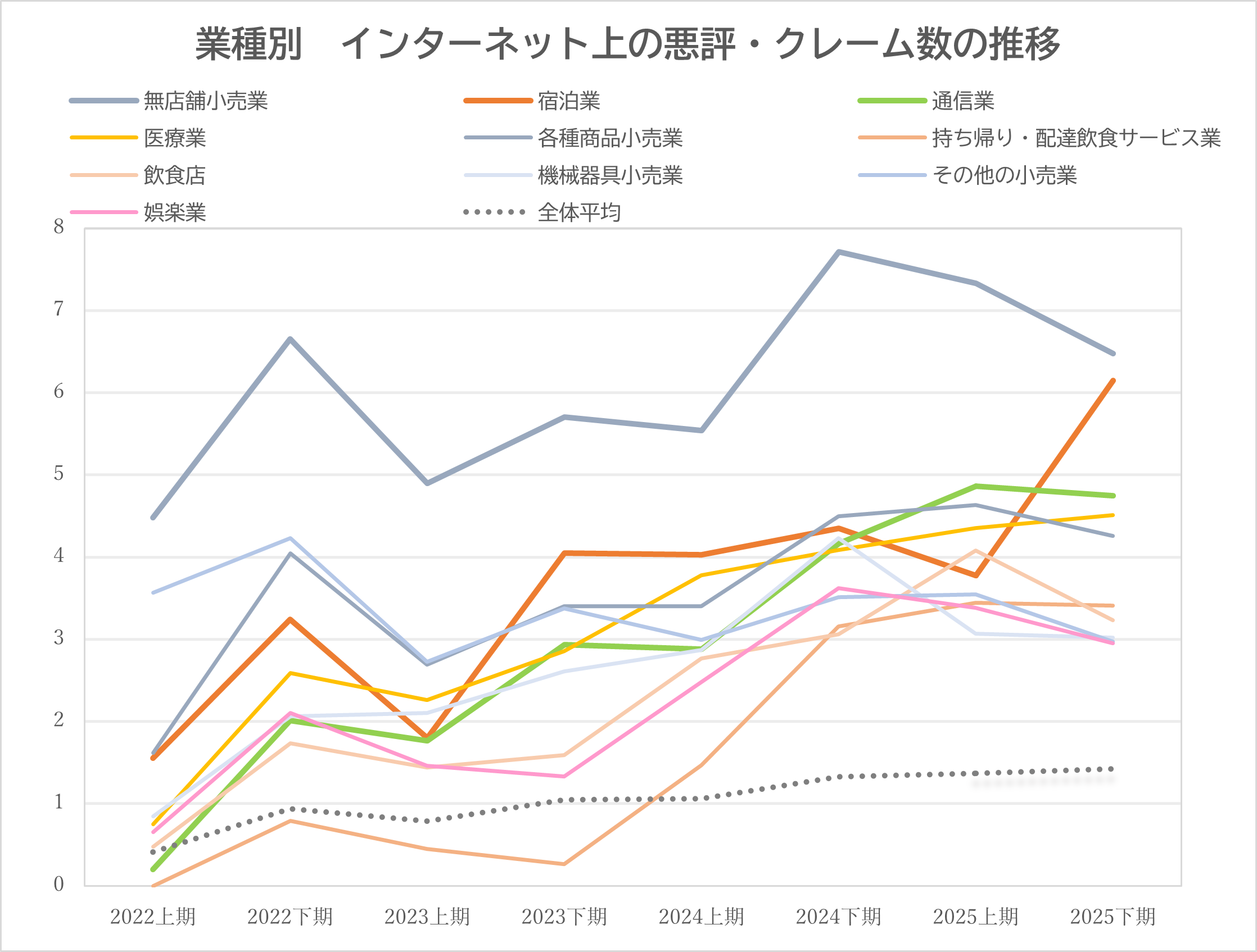 ECを中心とする無店舗小売業では、取引や問い合わせ、アフターサポートまで消費者との接点の多くがオンライン上で完結するため、悪評やクレームネット上に表出しやすい特性があります。一方で、近年は1社あたりの悪評・クレーム件数が減少していることから、対応体制の整備や情報提供の改善が進んでいる可能性がうかがえます。一方、宿泊業や娯楽業など、対面でのサービス提供を前提とする業種では、コロナ後の人流回復により利用者が戻ってきたことで、体験の質や対応への不満が再び表面化しやすくなっていると考えられます。これは、サービス品質が低下したというよりも、コロナ禍で一時的に抑えられていた対面型サービスへの期待や評価が、生活様式の回復とともに可視化されてきた結果と捉えることができます。