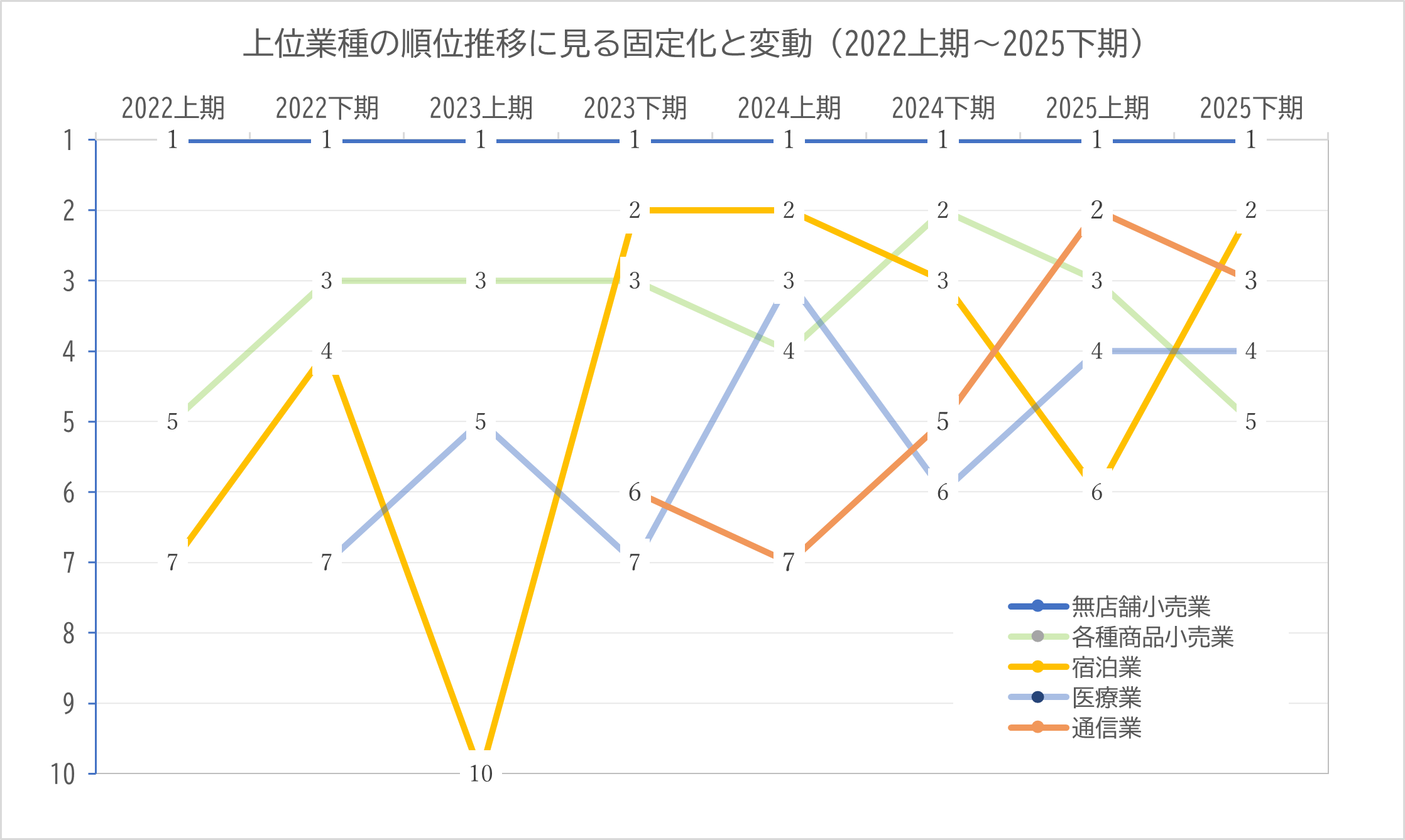 調査期間を通じて、無店舗小売業は、2022年上期から2025年下期まで、すべての調査期において1位を記録しています。一方で上位10業種の中でも順位の動きには差が確認されました。宿泊業は調査期ごとに順位の上下が大きく、2023年上期には10位まで落ち着いた一方、その後は上位圏に復帰しています。医療業は2022年下期以降、継続して上位10位以内に入り、直近では4位前後で推移しています。また、通信業は2023年下期以降に上位化し、2025年下期には3位となりました。